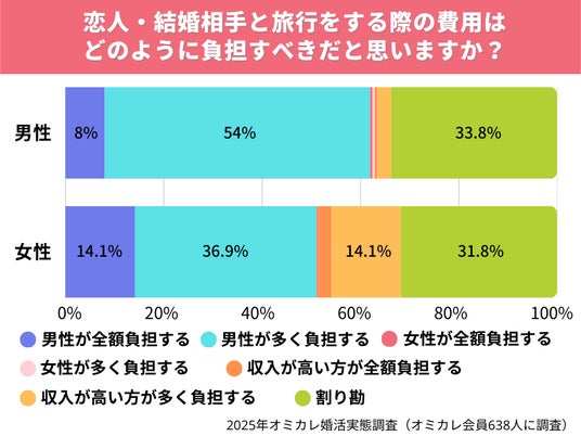 旅行費用の負担について、男性の約34%が「割り勘」と回答し、「男性が多く負担する」の約54%に次いで大きな回答となりました。
