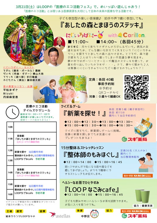 整体×骨盤サロン「カ・ラ・ダ ファクトリー」(以下 カラダファクトリー)を展開する株式会社ファクトリージャパングループ(本社:東京都千代田区、代表取締役社長:春名秀樹、以下 ファクトリージャパン)は、2026年3月21日(土)に、東京都中野区で行われた絵本ラウンジLOOPなかので開催されたイベント「第3回 医療のエコ活動フェス みんな元気にな~れ!」(以下、本イベント)に出展いたしました。
