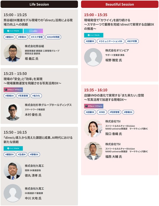ユーザーさまによる事例発表プログラムでは、DX成功事例について大手建設企業のリアルな声をお届けします。ビジネスチャット「direct」や、現場向けかんたん整理カメラ&クラウド共有「タグショット/タグアルバム」、長時間労働是正支援ソリューション「direct Smart Working Solution」を活用して、最新の生成AI活用やコミュニケーション改革、2024年問題といった現場課題をどのように解決したのか、具体的に発表いただきます。また今年新たに実施する取り組みとして、この時間は[Life Session][Beautiful Session]の2セッションに分けて進行します。