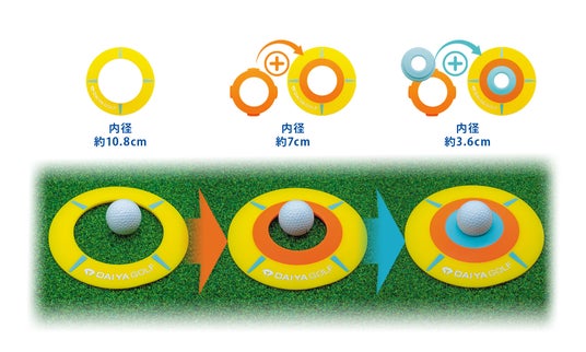 そこでダイヤゴルフは、カップを組み合わせることによって、ジャストタッチでピタッと止まる超小型カップに挑戦できる『ダイヤ3WAYターゲットカップ』を発売します。