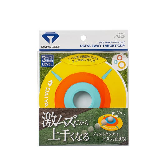 『ダイヤ3WAYターゲットカップ』はレベルに応じた難易度に変えて練習することができます。イエローカップのみで使用すると実際のカップサイズでの練習に。繰り返し練習して慣れてきたらオレンジカップを追加することで内径約7cmの小型カップとなり難易度アップ。さらにブルーカップを追加することでジャストタッチでしかカップインしない超小型カップに挑戦できます。