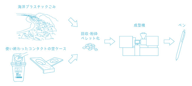 商品本体の軸材には、海洋プラスチックごみを使用した再生樹脂とコンタクトレンズの空ケースを使用した再生樹脂のポストコンシューマー材をほぼ100%採用しています。