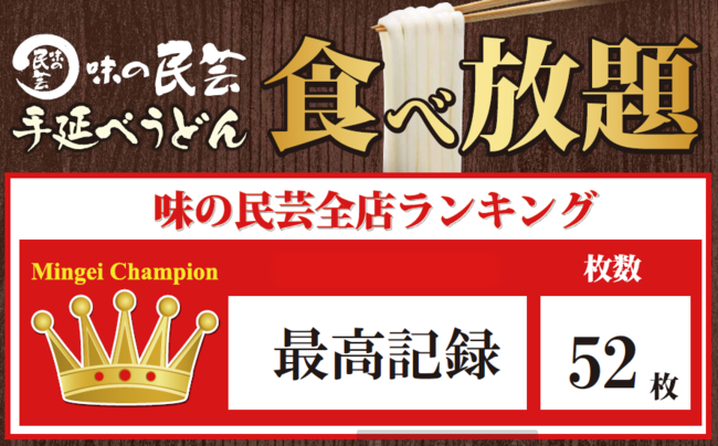 味の民芸『手延べうどん食べ放題』の最高記録はセイロ52枚となっています。手延べうどんの重量にして、