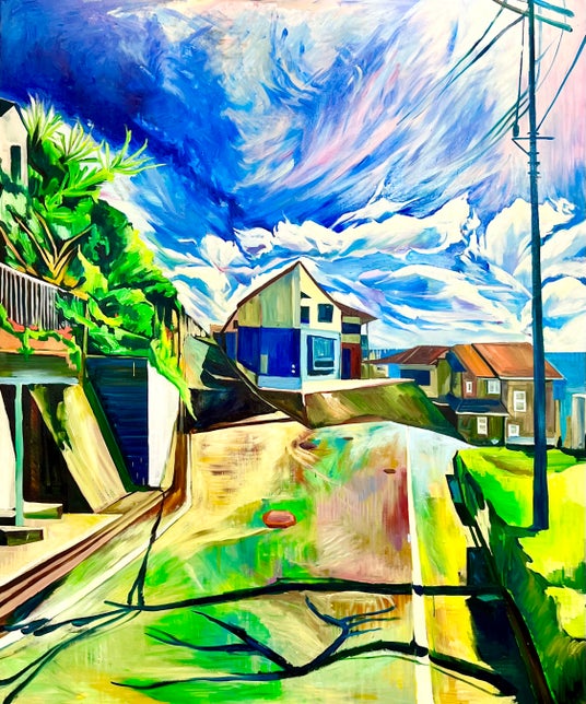 私の絵画は、実際に見たときの色や形とは違う私のフィルターを通して描かれる世界です。 私は、普段の生活の中でスマートフォンカメラや一眼レフを使って気軽に写真を撮り続けて残しています。実際に描かれるモチーフは、その普段の何気ない日常の一場面から切り取られたものです。