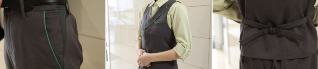 今回、完成したユニフォームのベストやパンツはホテルの制服にも採用されているウール調のポリエステルを使用しました。ウールのようなルックスでありながら、着心地は軽く、お手入れが簡単な素材です。パンツの腰の部分や股下には伸縮生地が入っており、屈伸時など作業の際のストレスを少しでも軽減できる仕様になっています。