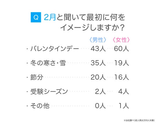 成人男女200人に「2月と聞いて、最初に何をイメージするか」を尋ねたところ、「バレンタインデー」が103人と最多となりました。