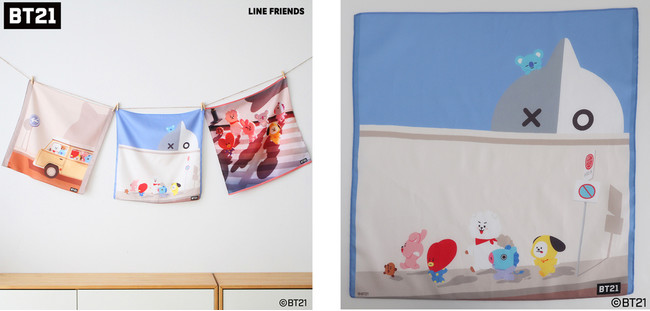 「BT21」のアートを大胆にデザインし、キャラクターたちが過ごす楽しい日々を表現しました。手を拭くのはもちろん、ファブリックポスターとしてお部屋に飾るのもおすすめです。