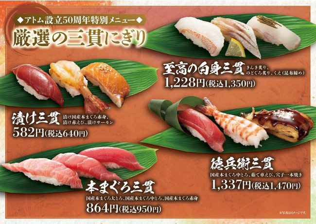コロワイドグループの株式会社アトム(本社:神奈川県横浜市、代表取締役社長:山角豪)は、2022年1月14日(金)にアトム設立50周年を迎え新たに設定した「おいしい!たのしい!うれしい!」ACTIONの一環として、「にぎりの徳兵衛」各店で、2022年2月22日(火)より期間限定で、高級ネタが勢ぞろいした「厳選の三貫にぎり」4種類を販売いたします。