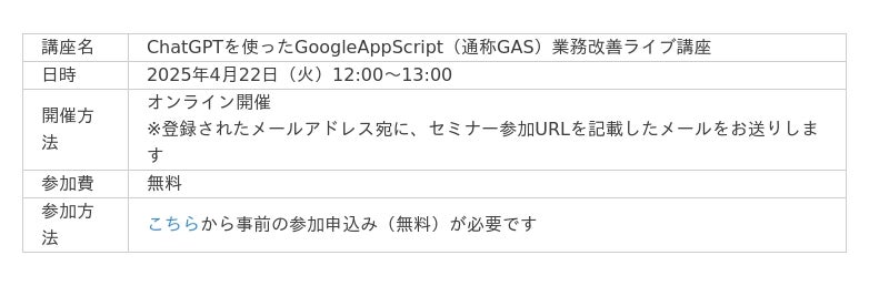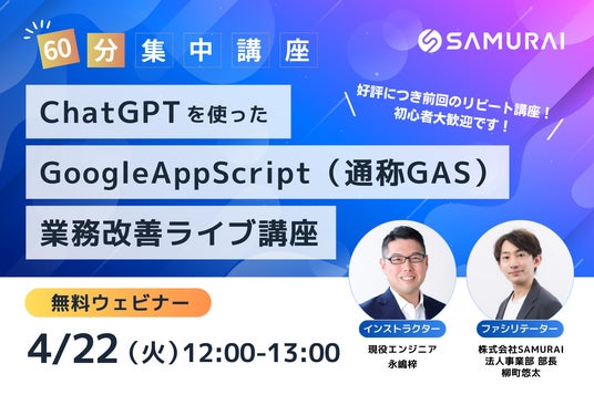 プログラミングスクール「侍エンジニア」を運営する株式会社SAMURAIは、60分で生成AI×プログラミングの可能性を体感できる『ChatGPTを使ったGoogleAppScript(通称GAS)業務改善 ライブ講座』を4/22(火)に無料で開講いたします。