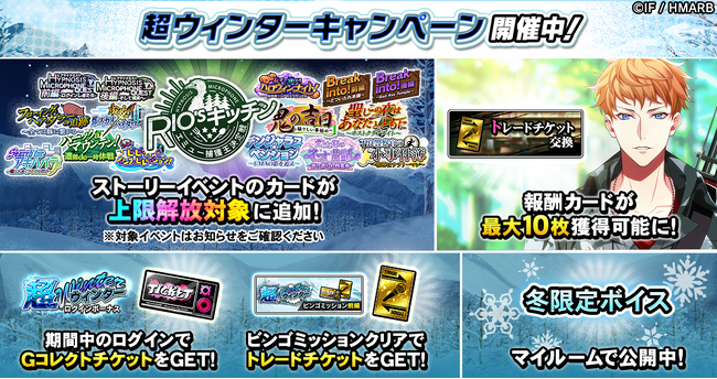 期間中、「Gコレクトチケット」が獲得できるログインボーナスやビンゴミッションを開催しているほか、マイルームで「冬」に関する期間限定ボイスを聴くことが可能です。