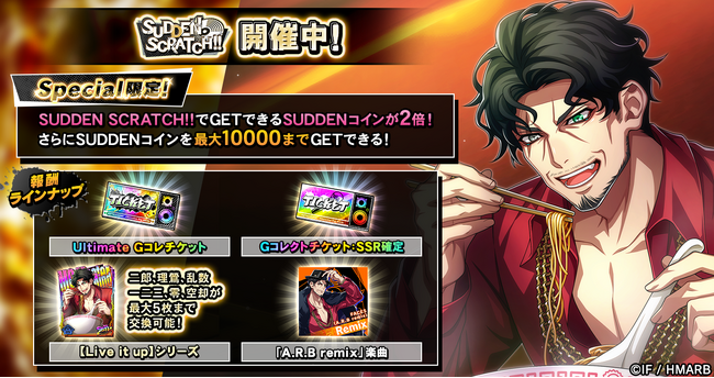 イベント期間中、KILLER SCRATCH!!をプレイするとライズ消費量に応じた確率でSUDDEN SCRATCH!!が発生します。SUDDEN SCRATCH!!をプレイすると、通常の報酬アイテムの他、限定アイテム「SUDDENコイン」を獲得することができます。「SUDDENコイン」を集めることで、「Ultimate Gコレチケット」やこれまでに登場したストーリーカード【Live it up】シリーズを最大5枚まで獲得できるほか、「A.R.B remix」楽曲などと交換することが可能です。Spacialの期間中は、SUDDENコインの獲得量が通常のSUDDEN SCRATCH!!の2倍になり、より集めやすくなっています。