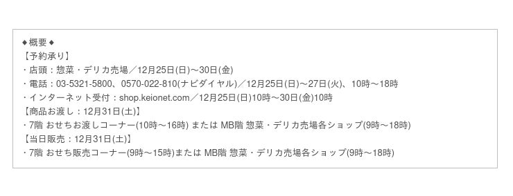 株式会社京王百貨店(本社:東京都新宿区、社長:仲岡一紀)新宿店では、12月25日(日)から、直前でも買えるおせちの予約承りを開始します。