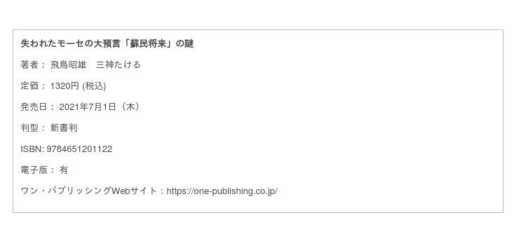 株式会社 ワン・パブリッシング(東京都台東区/代表取締役社長:廣瀬有二)は、2021年7月1日(木)に『失われたモーセの大預言「蘇民将来」の謎』(定価:1,320 円(税込み)を発売いたしました。