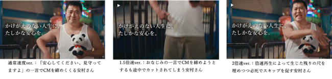 この結果を受けて本CMは、速度の異なる全5パターン(通常速度、1.25倍速、1.5倍速、1.75倍速、2倍速)に編集して損保ジャパン公式SNSを中心に公開します。