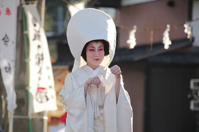 江戸時代の嫁入りを再現した「つがわ狐の嫁入り行列」は白無垢姿の狐メイクを施した花嫁が夕方から夜にかけて街道を練り歩き、お供を連れて行列します。町では灯りを消し松明や提灯で幻想的な雰囲気を演出します。