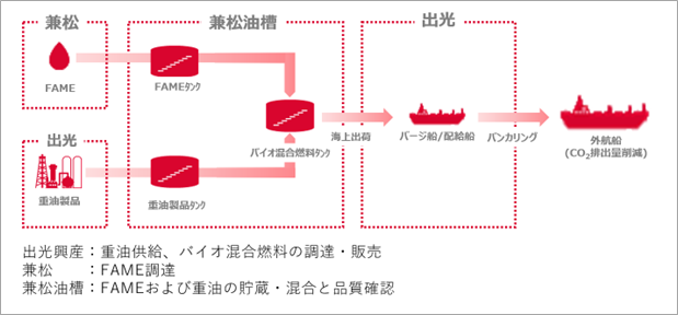 本取組みでは、兼松油槽の小倉油槽所(福岡県北九州市)の陸上タンクと、同社の海上出荷設備を活用します。兼松油槽は、兼松が調達したFAMEと出光興産が供給する重油を、バイオ混合燃料タンクにてブレンドし、品質確認の上、外航船へのバンカリング(燃料供給)に向けた海上出荷を行います。