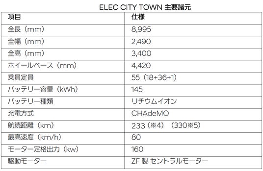 「ELEC CITY TOWN」は、日本のバス車体規格ガイドラインに準拠し、日本市場のニーズに合わせた路線バスです。ワンマン路線バスに必要な装備の架装に対応。リチウムイオンバッテリーを搭載し220km以上の航続距離を確保(※1)。新規車輌登録後からフロントガラス、サイドミラー(片側)は10年間、タイヤパンクは5年間にわたり修理・交換サービスをご提供します(※2)。また、乗客乗下車時の死角地帯の障害物を感知する「SEW-Near」機能、各種センサーで車両の挙動を測定し、モーターの出力・ブレーキを制御する事で悪天候や滑りやすい路面でも車輌のコントロールを容易にする「VDC(車輌安定装置)」など、日本の路線バス運行で求められている各種安全装置を標準装備しています。