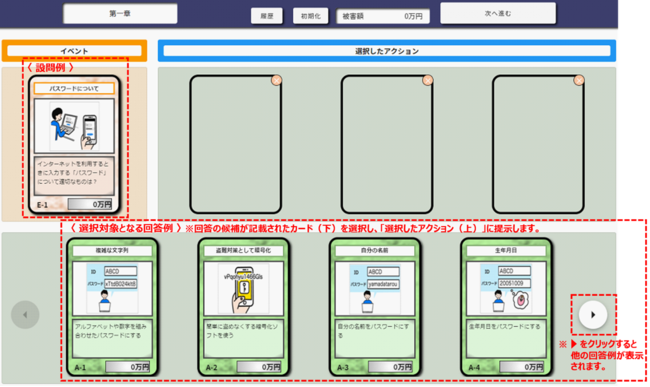 ネットを活用する際の実際の体験に近い状況をカード(以下イメージ参照)で示すことで、設問とそれに対する自分のアクションを考えながら回答することができ、ネット社会における様々な対応を体験的に学習することが可能です。