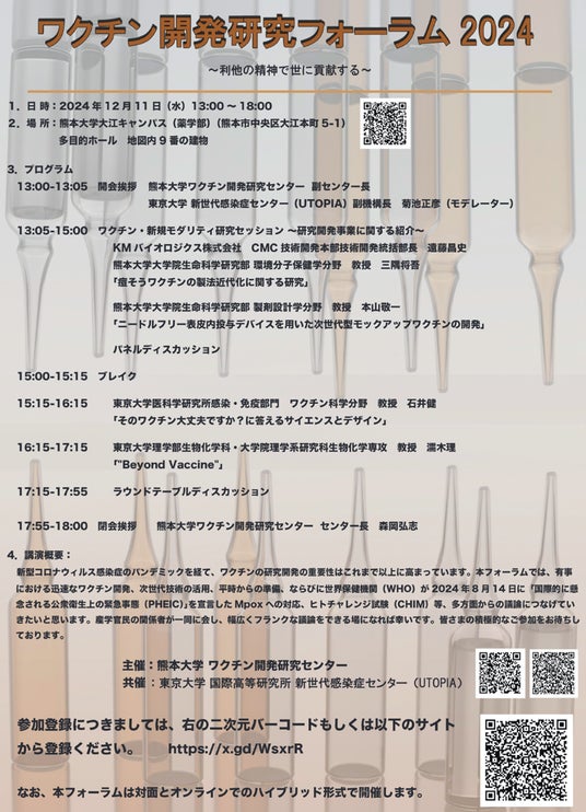 熊本大学大学院生命科学研究部附属ワクチン開発研究センター(以下、「熊本大学ワクチン開発研究センター」という)は、東京大学国際高等研究所 新世代感染症センター(UTOPIA)と協働し、2024年12月11日(水)「ワクチン開発研究フォーラム2024」を開催いたします。本フォーラムは、最新のワクチン研究動向や感染症対策、次世代型ワクチン開発の最前線について、産学官が一体となって議論し、知見を深める貴重な機会となります。皆様のご参加、お待ちしております。