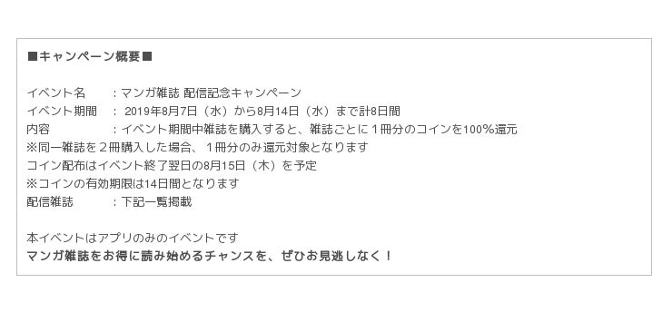 また、その記念イベントとして雑誌購入ごとに1冊分のコインが還元される、お得なキャンペーンを実施いたします。イベント詳細は、下記概要よりご確認お願いいたします。