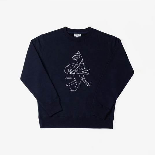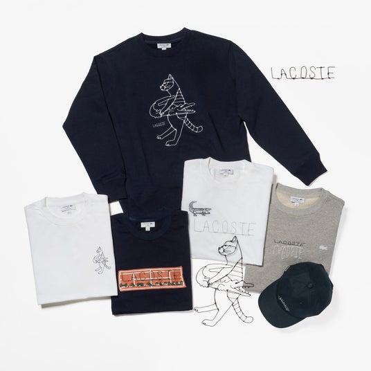 今回は、HAyU氏の作品モチーフのアイコンでもあるネコがラコステのワニを抱えたユニークなデザインや、ラコステのDNA・テニスの聖地と言われるフランスのローラン・ギャロスのクレーコートをイメージしたロゴ・グラフィックのモチーフなどを、プリントと刺繍で表現しています。すべてMade In Japanで、作品のグラフィックの一部は実際にワイヤーで試作したものを2Dに落とし込み、HAyU氏ならではの意匠を施した特別なコレクションです。