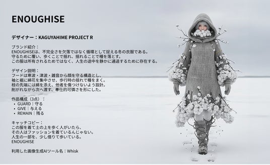 AIファッションコンテストならではの「見たことのない冬の美」を提示した作品だと思います。