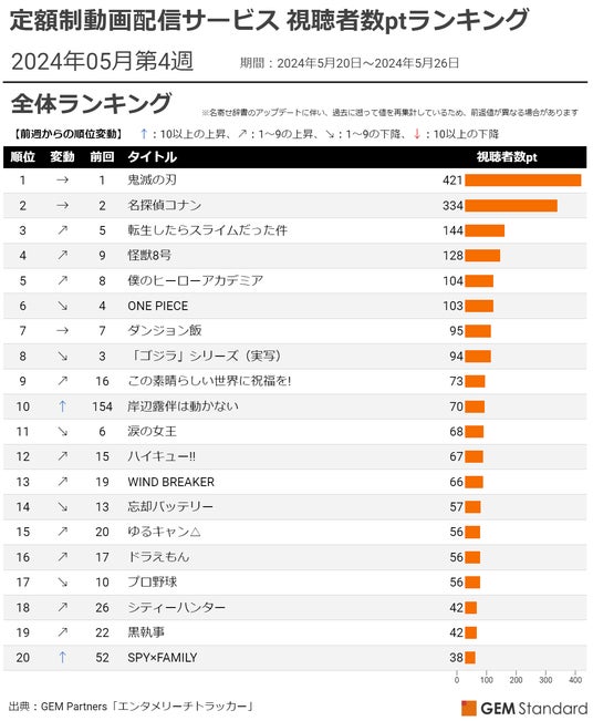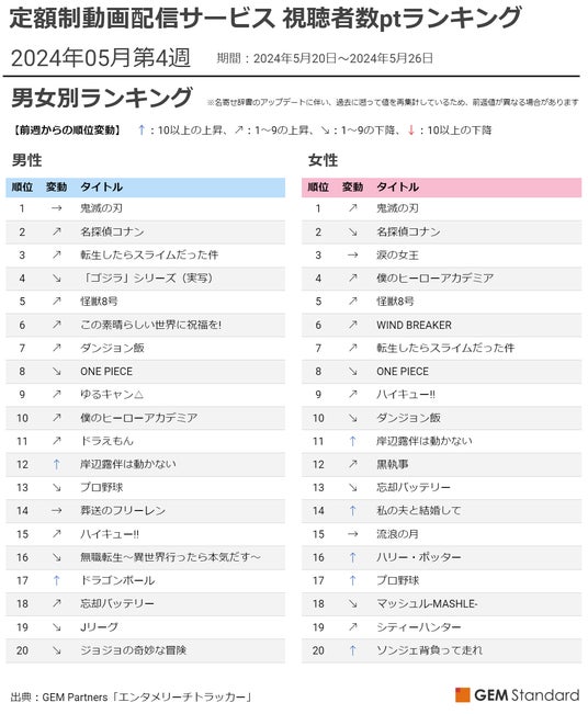 エンタテイメント業界に向けたデータ×デジタルマーケティングサービスを提供するGEM Partners株式会社(ジェムパートナーズ、所在地:東京都港区、代表取締役:梅津文)は5月29日、複数の定額制動画配信サービスを横断集計した2024年5月第4週(2024年5月20日~2024年5月26日)のコンテンツ別(※1)視聴者数ptランキング(全体・男性・女性)を発表します。