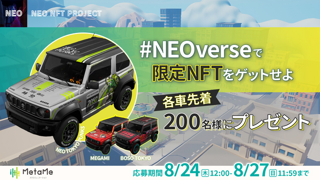 内容:MetaMe内のどこかに設置されたコラボカーNFTを見つけ、MetaMeでマイアバターと一緒に写真を撮影。Twitter(X)でNEOとMetaMeの公式アカウントをフォローの上、「#NEOverse」のハッシュタグをつけてキャンペーン告知を引用リツイートすると、各デザイン先着200名がコラボカーNFTを獲得できます。
