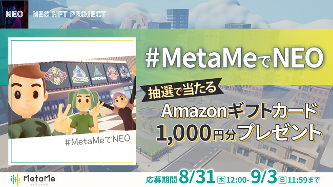 内容:フレンドとカフェ内のチームロゴ前に集まった画面をキャプチャ後、Twitter(X)でNEOとMetaMeの公式アカウントをフォローの上、「#MetaMeでNEO」のハッシュタグをつけてキャンペーン告知を引用リツイートすると、後日Amazon*3ギフト券を抽選で進呈します。