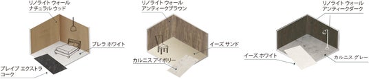 また近年、ナチュラルでシンプルな日本 (Japan) と北欧 (Scandinavia) のインテリアスタイルを組み合わせた”Japandi Style”(ジャパンディスタイル)が海外で流行しており、そのスタイルの1つとして木目調の壁材「リノライト ウォール」と柔らかな石目調のセラミックタイルを組み合わせ、自然素材のイメージを取り入れたリラックスできる空間をコーディネートします。