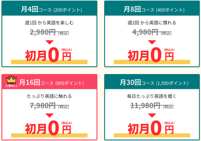 このキャンペーンは全プランがご利用できますので、最大30回(11,980円相当)のレッスンも初月無料