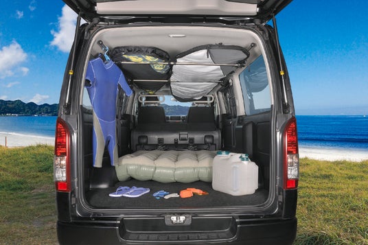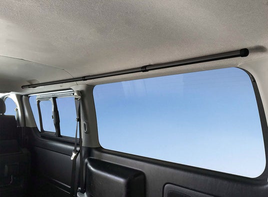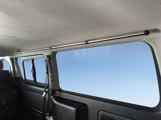 車内キャリアは、ハイエースやNV350キャラバン、軽ワゴンなど様々なクルマの空間を有効に利用するためのシステムです。両サイドのアシストグリップ部にサイドバーを固定し、ハンガーバーを組む事で車内天井にサーフボードやネットを収納するスペースを作ったり小物を吊るすことができます。