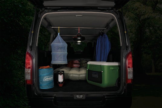 キャンプ道具積載。ランプや小物を吊るして使用
