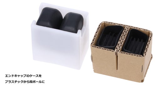 これまでのパッケージはブルー地にブランド色を刷り込んでいましたが、上記目的のもと新パッケージにリニューアルします。段ボール加工の工程がなくなる事で二酸化炭素の排出を軽減します。梱包素材だけでなく、エンドキャップの収納に使用していたプラスチックも廃止します(下写真)。これにより、年間約4tのプラスチックを削減(年間販売想定数からの試算)できる計画です。