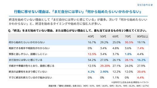 こうした意識の変化が広がる一方で、終活に必要性を感じながらも行動に移せないシニアが多いのも現実です。本調査でも、「まだ自分には早いと感じている」「何から始めたらいいかわからない」という声が行動できない理由の上位を占めており、関心と行動のあいだには、まだ大きな溝があります。