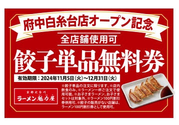 さらに!オープンを記念して、「府中白糸台店」にご来店いただいたお客様には全店舗でご使用いただける餃子単品無料券を配布いたします。