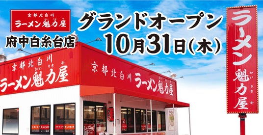 京都北白川ラーメン魁力屋をチェーン展開する株式会社魁力屋(https://corp.kairikiya.co.jp/本社:京都市中京区、代表取締役社長:藤田 宗、以下魁力屋)は、2024年10月31日(木)に「京都北白川ラーメン魁力屋 府中白糸台店」を東京都府中市にグランドオープンいたします。