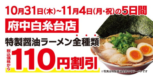 この度オープンを記念して、「府中白糸台店」にご来店いただいたお客様には、『特製醤油ラーメン全種類』を税込価格から110円割引で販売いたします。