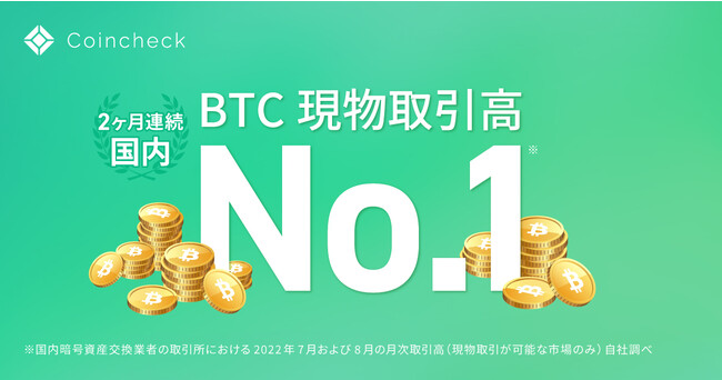 コインチェック株式会社(本社:東京都渋谷区、代表取締役:蓮尾 聡、以下、当社)の提供する暗号資産取引サービス「Coincheck」では、2022年7月および8月の取引所取引におけるビットコイン現物取引高が2ヶ月連続「国内No.1(※1)」を記録しました。