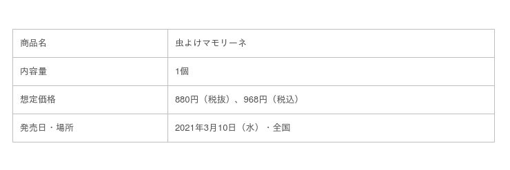 虫よけマモリーネは、当社の「お客様のお気づきを活かす窓口部」によせられたお客様のご意見をもとに開発し、新発想の携帯用虫よけとして新発売いたしました。