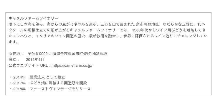 キャメルファームワイナリー https://camelfarm.co.jp/は、 眼下に日本海を望み、海からの風がミネラルを運ぶ、余市町登地区に位置します。なだらかな丘陵に広がる13ヘクタールの垣根仕立てのぶどう畑から、品種の魅力、テロワールの特長を最大限に引き出すワイン造りに取り組んでいます。
