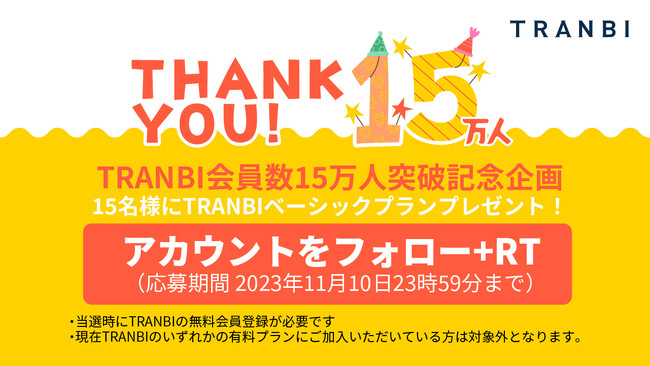 国内最大級の事業承継・M&Aプラットフォーム「TRANBI」を運営する株式会社トランビ(本社:東京都港区、以下「トランビ」)はこの度、2023年10月21日にTRANBIの会員数が15万者を突破したことを記念して、X(旧Twitter)の弊社公式アカウント《トランビ【日本最大級M&Aプラットフォーム】@tranbi_tw》でキャンペーンを実施しています。