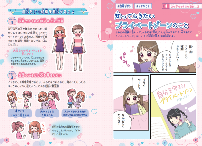 思春期にさしかかる小学校中学年は、体型の変化や生理など身体的な変化が気になりだすころ。また、からだの変化に伴って、こころも大きく成長する時期です。本書ではそんな女子小学生に向け、スキンケアの基本知識から、生理のときの過ごし方、ぴったりな下着の選び方、プライベートゾーンの守り方、正しい体の使い方、好きな人との関わり方などをマンガやイラストたっぷりで解説しています。