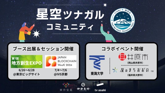 株式会社テレビ朝日(代表取締役社長:篠塚 浩、以下「テレビ朝日」)は、星空保護区の認定を受けた東京都神津島村が取り組む東京宝島サステナブル・アイランド創造事業(*1)において、日本中、ひいては世界中の星空好きと繋がる共創型「星空ツナガルコミュニティ」を4月11日に発表(*2)しました。このたび、第7回地方創生EXPO (6月26-28日)にてブース出展、東海大学観光学部小谷ゼミとコラボしセッションステージでの発表および9月コミュニティWeek内での星空保護区・岡山県井原市、福井県大野市、東京都神津島村での星空イベントへの一般参加者募集を開始予定です。さらに、IVS京都の期間中7月4日では、公式ネットワーキング(サイド)イベント&セッション登壇を通じて、さらなるコラボ企業団体募集・コミュニティメンバー募集を行います。