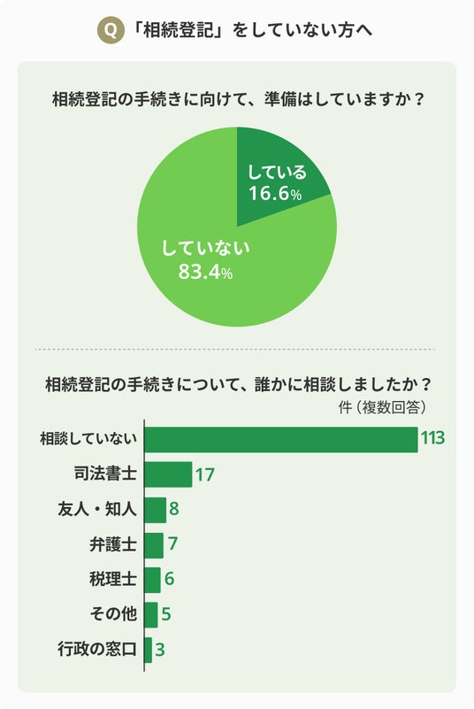 他方で、上記で「相続登記」を「していない」と回答した151人に対して、「相続登記の手続きに向けて、準備はしていますか?」と質問したところ、83.4%に当たる126人が「していない」と回答しました。
