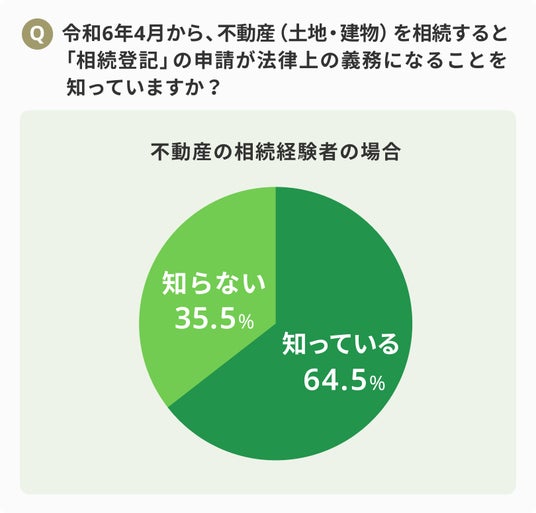 不動産の相続をしたことがある方400人を対象に、2024年4月から施行される「相続登記の義務化」について、その認知度を調査したところ、「知っている」と回答した方は64.5%となりました。