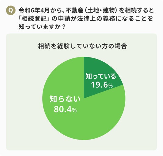 一方で、相続を経験したことがない方500人を対象に同じ質問をしたところ、「知っている」と回答した方は19.6%に留まり、8割以上の方が相続登記の義務化について認知していないことがわかりました。