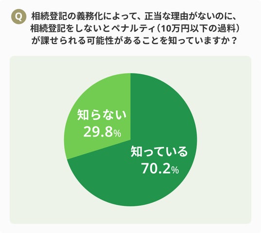 また、同様に「正当な理由がないのに、相続登記をしないとペナルティ(10万円以下の過料)が課せられる可能性があることを知っていますか?」と質問したところ、70.2%の方が「知っている」と回答しています。