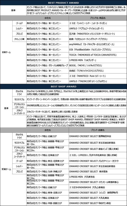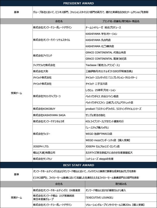 「オンワードグループ表彰式」は、優秀なファッションスタイリスト(販売職)と、優れた商品開発やお客さまの消費意欲を喚起する仕掛けを行った社員を対象に2008年にスタートし、過去25回開催してきました。年度の集大成としてグループが推進する事業にフォーカスし、店舗からバックオフィスまで様々な部署にて活躍した社員(チーム)を賞賛し、モチベーションアップと優れたノウハウの共有を図ることで、販売力および企画・提案力のさらなる向上につなげていくことを目的としています。