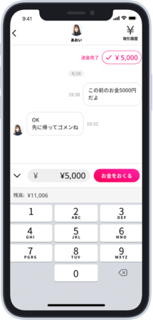 チャット機能を通して、会話の流れの中で自然にお金のやりとりができるので、現金特有の気まずさを感じることなく、お金コミュニケーションをお楽しみいただけます!